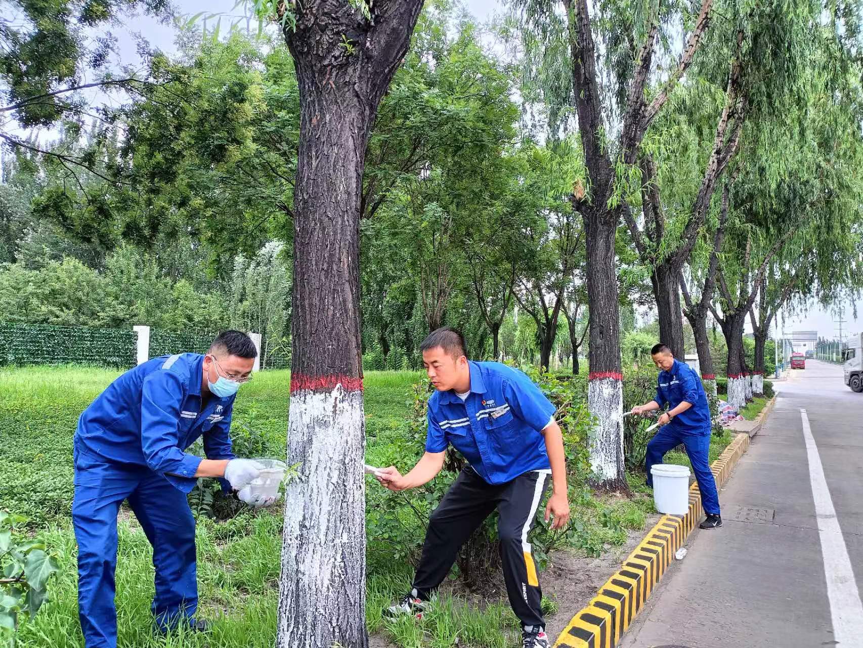 活動中,黨員們拿著水桶、刷子等工具分別來到廠區主干道,對道路兩旁的樹木進行涂刷。大家相互配合、干勁十足,有人負責刷白,有人負責涂紅……刷樹過程中,還掌握了不少的竅門,做到了樹干粉刷高度一致、刷涂均勻。即使石灰沾在手上、衣服上、鞋上,大家也全然不顧,哪怕彎腰、蹲下、站起動作重復了多次,也從不說累。經過3個多小時的辛勤勞動,大家為廠區內近200多棵樹木穿上了“潔白的外衣”,系上了“紅絲帶”。
