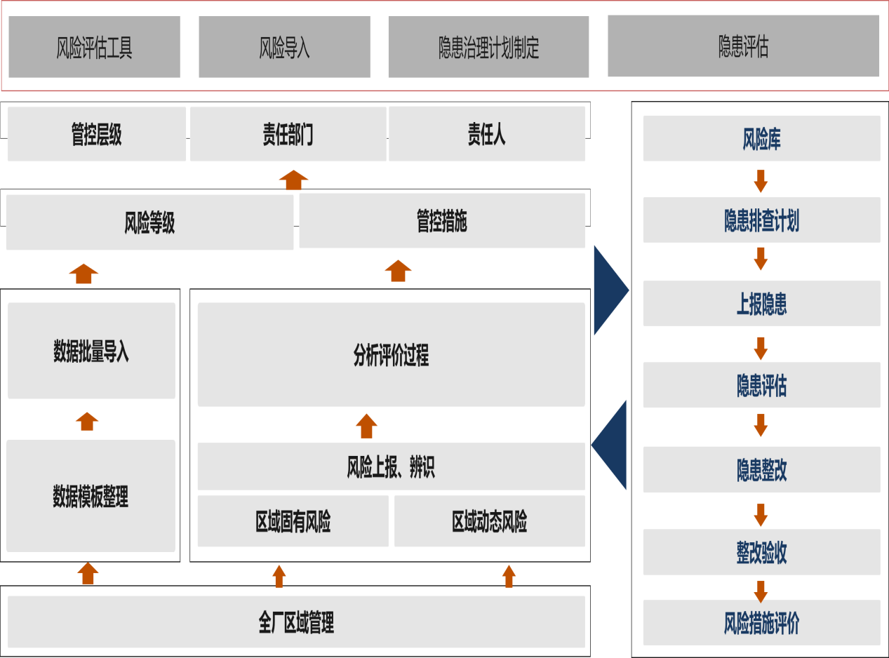 其中,風險分級管控功能模塊利用風險隱患庫的數據支撐,助力基層管理人員的風險辨識登記、評價分級、管控措施制定等一系列風險分級管控工作,實現了對安全管理風險源頭治理、關口前移,全面匯總管理區域內的風險隱患并輸出符合風險分級管控相關管理要素的清單、報表;隱患排查治理功能模塊涵蓋了安全隱患排查治理各環節基本要素和工作內容,通過PC端和手機APP實現以安全隱患排查治理業務為主線的移動線上管理,能夠對隱患排查治理及時、有效跟蹤,實現隱患排查、上報、整改、驗收、記錄留痕、表單存檔閉環管理;數據監測中心功能模塊基于電子地圖進行相關數據、信息展示服務,通過不同的圖層切換,實現危險源、安全隱患、特殊作業分布、有毒可燃氣體監測、視頻監控多種專題圖的可視化形象展示。