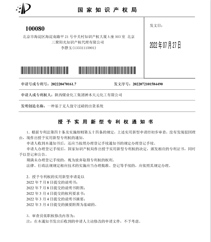 7月27日,神木煤化工天元公司申請的“一種基于無人值守過磅的出貨系統”實用新型專利獲得國家知識產權局授權。