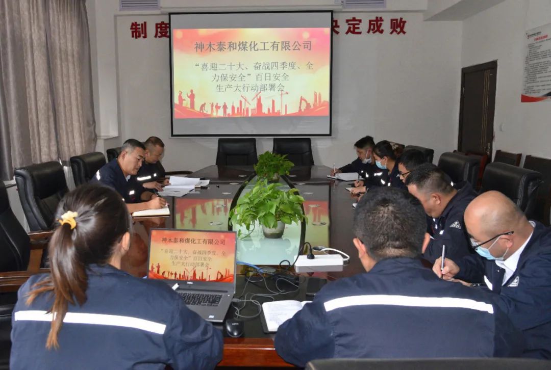 會議傳達學習了陜煤集團、神木煤化工公司《關于開展“喜迎二十大、奮戰四季度、全力保安全”百日安全生產大行動的通知》,對泰和公司近期推進的安全生產標準化提級達標、雙重預防機制數字化建設及石灰車間石料大棚建設施工安全管理等重點工作進行部署安排。