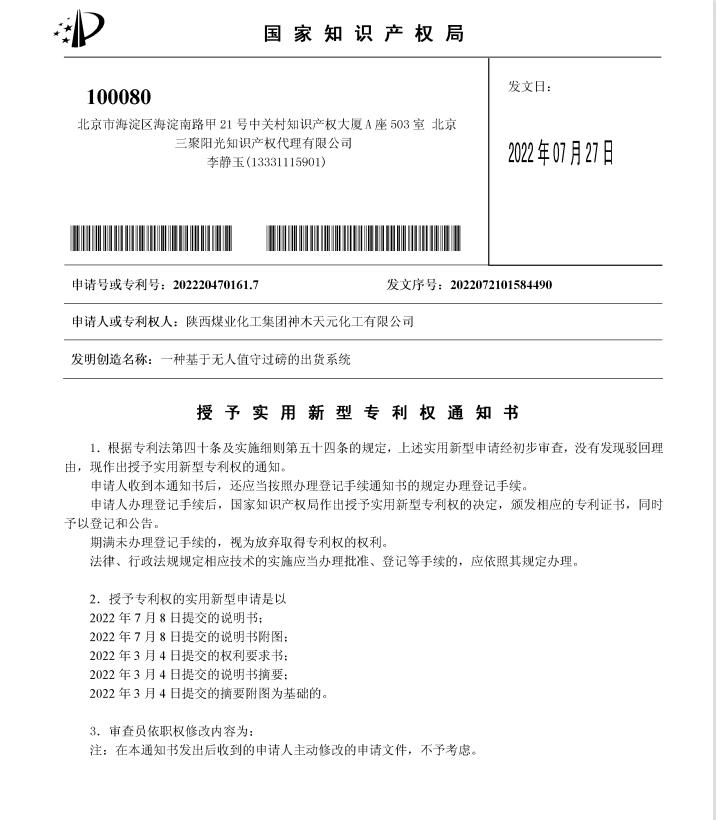 近日,神木煤化工天元公司申請的“一種基于無人值守過磅的出貨系統”實用新型專利獲得國家知識產權局授權。