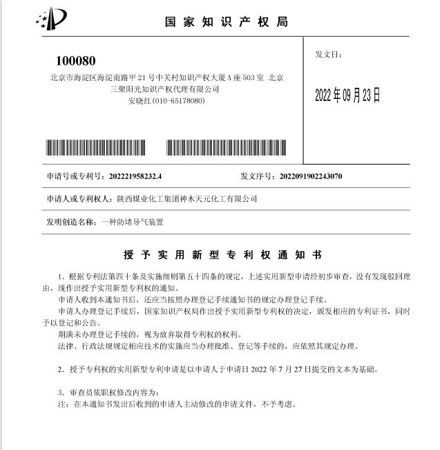 陜煤網站:神木煤化工天元公司“一種防堵導氣裝置”獲國家實用新型專利