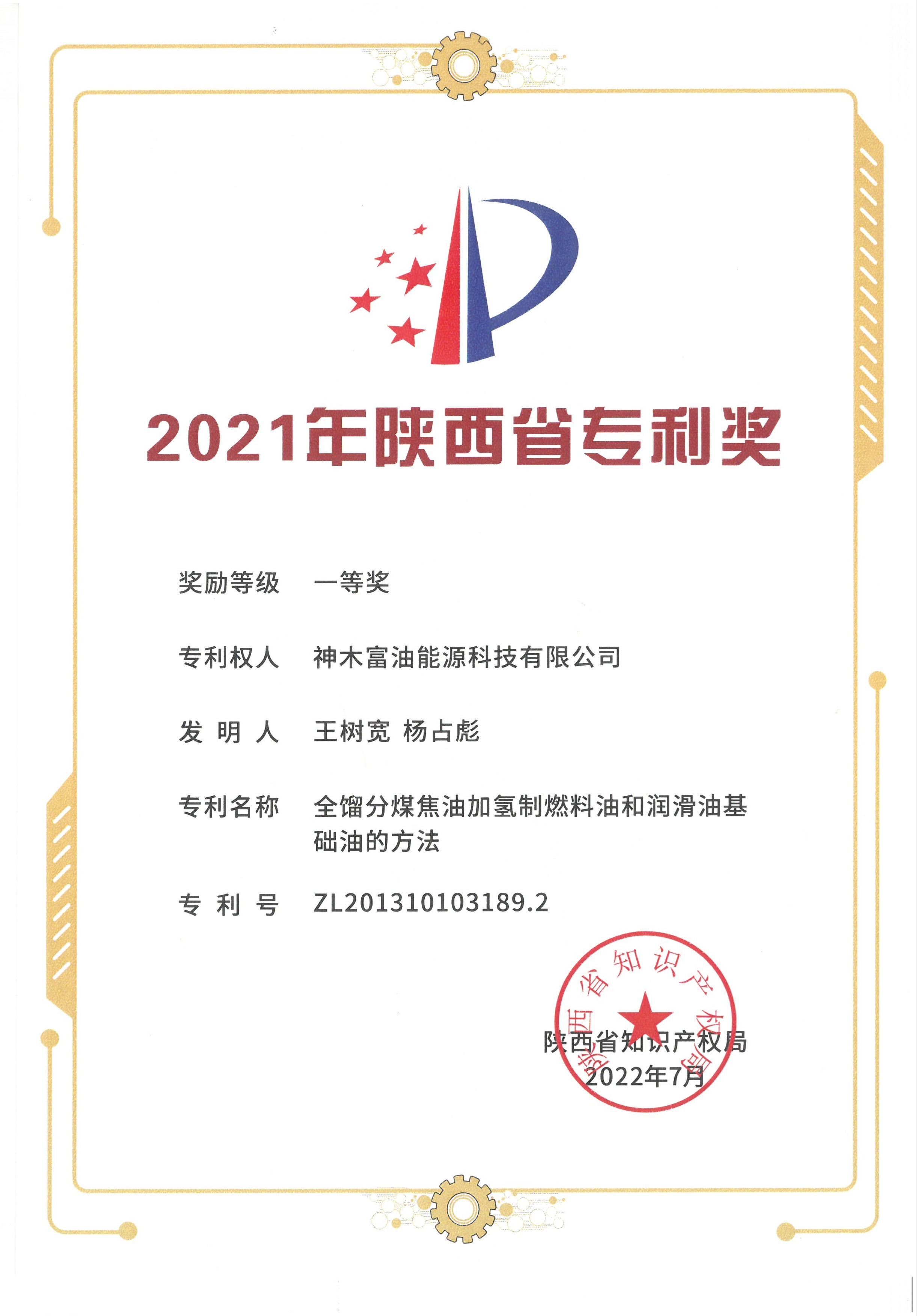 近日,從陜西省知識產權局獲悉,神木煤化工富油公司自主研發的“全餾分煤焦油加氫制燃料油和潤滑油基礎油的方法”專利技術榮獲2021年“陜西省專利獎”一等獎。