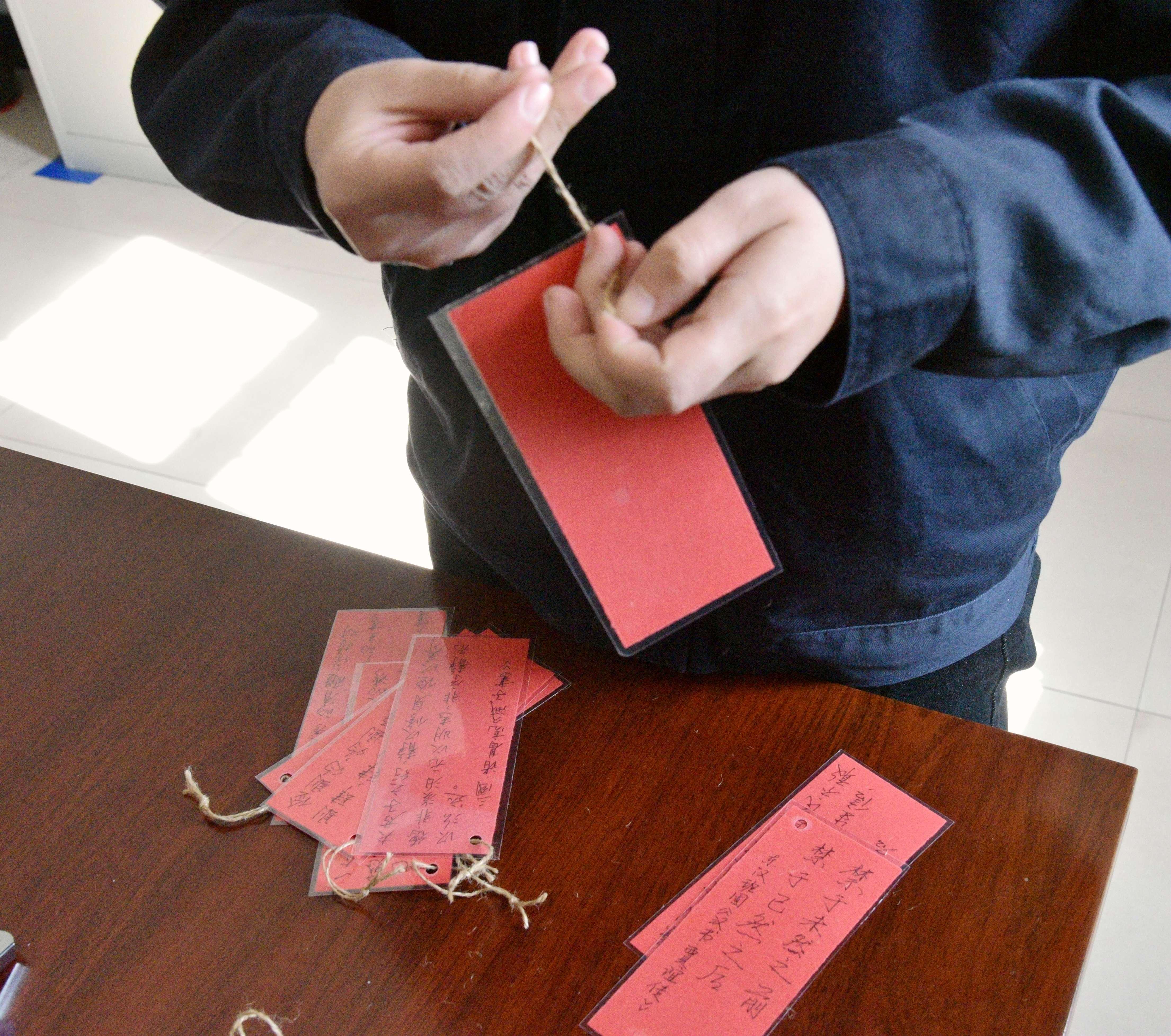 “我們制作的書簽長約5厘米,寬約10厘米,選擇紅色卡紙為底色,鋼筆書寫,麻繩系之,紅色代表的是不越紅線,不忘初心,麻繩代表著樸素,警示黨員干部們要堅持尚儉戒奢,廉潔修身”綜合黨支部的小白邊系麻繩邊介紹說。