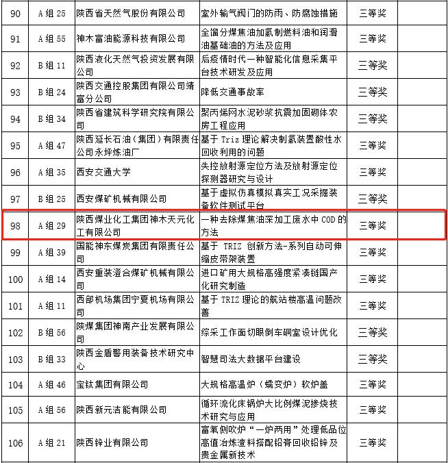 近日,“秦創原?涇河杯”2022年陜西省創新方法大賽決賽結果出爐。神木煤化工天元公司申報的“一種去除煤焦油深加工廢水中COD的方法”項目榮獲三等獎。
