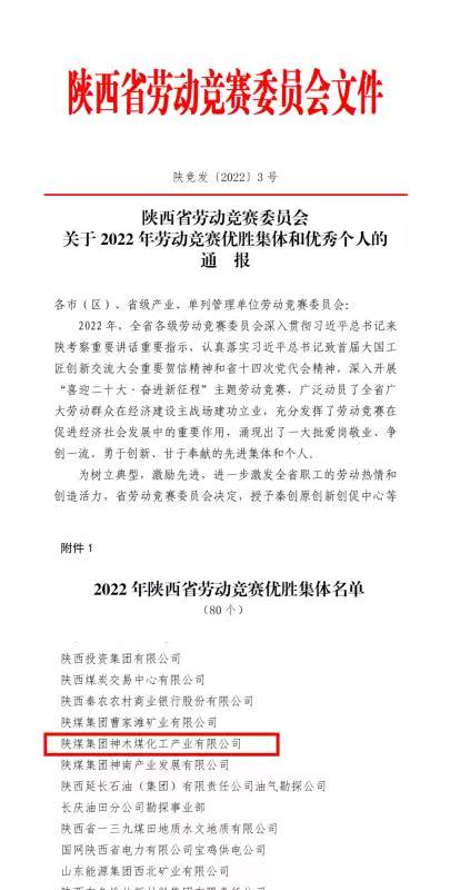 近日,陜西省勞動(dòng)競(jìng)賽委員會(huì)下發(fā)《關(guān)于2022年勞動(dòng)競(jìng)賽優(yōu)勝集體和優(yōu)秀個(gè)人的評(píng)選結(jié)果的通知》,神木煤化工公司榮獲“2022年陜西省勞動(dòng)競(jìng)賽優(yōu)勝集體”。