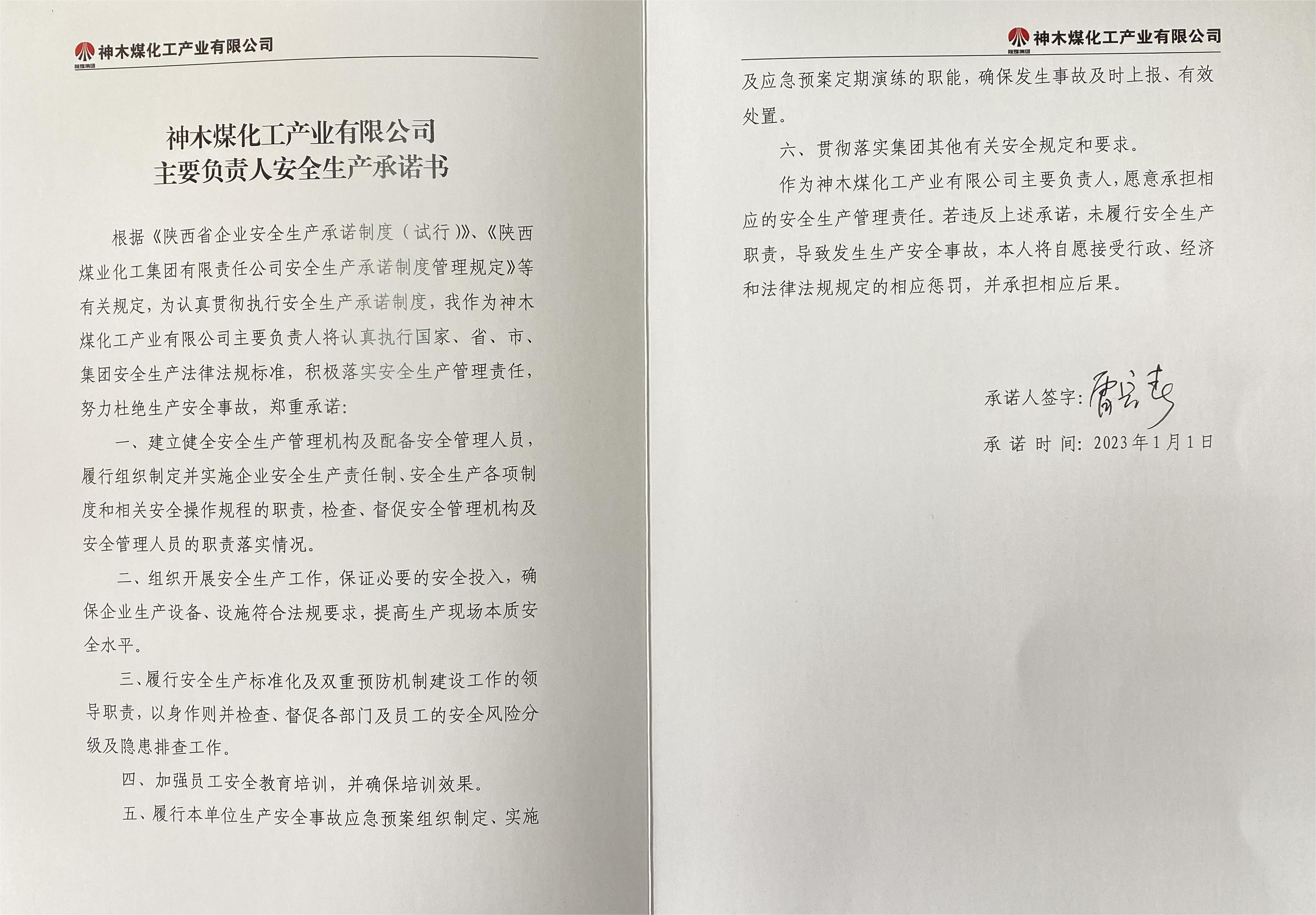 神木煤化工產業有限公司2023年度主要負責人安全生產承諾書公示