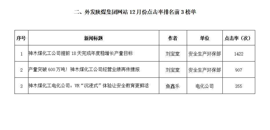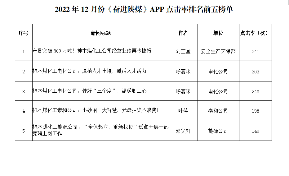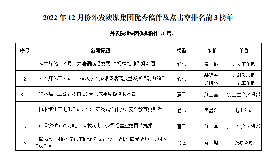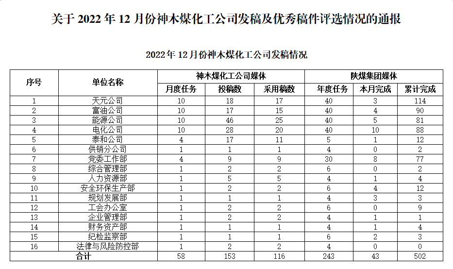 關于2022年12月份神木煤化工公司發(fā)稿及優(yōu)秀稿件評選情況的通報