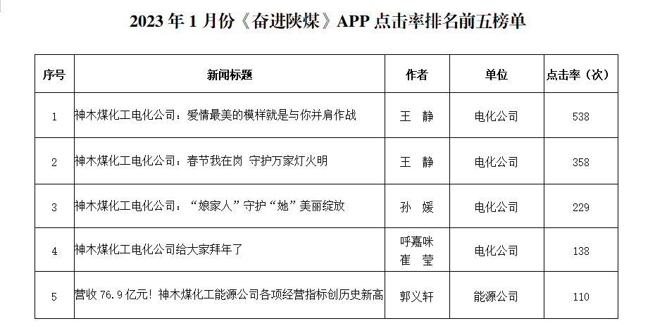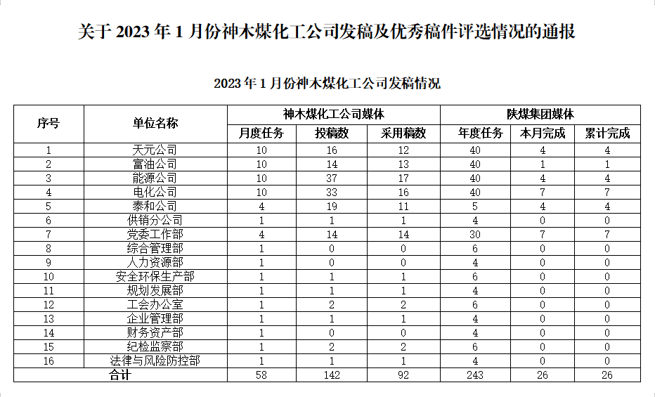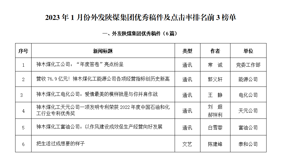 關于2023年1月份神木煤化工公司發稿及優秀稿件評選情況的通報