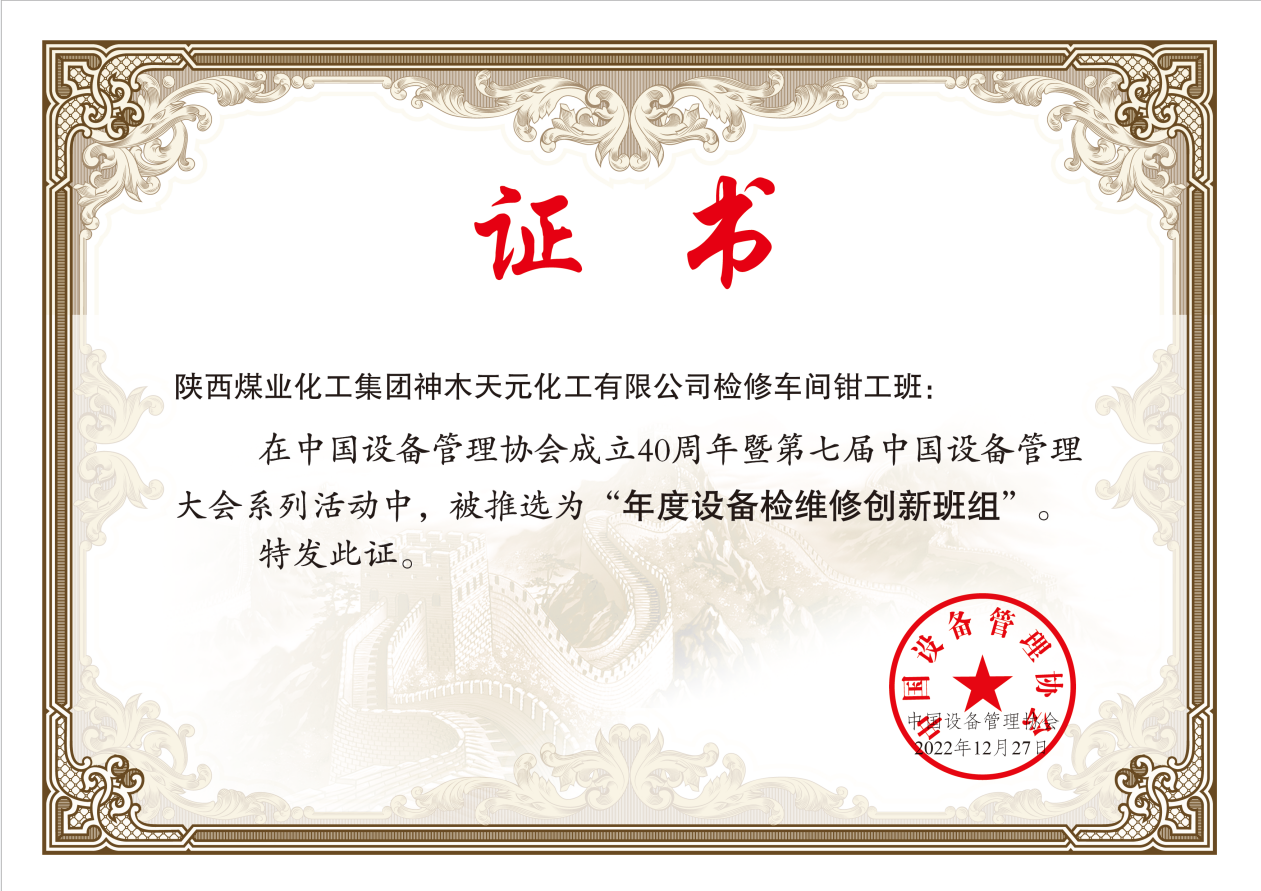 檢修車間鉗工班是神木煤化工天元公司最早組建的機械專業班組,多次榮獲天元公司先進班組、安全生產先進班組等,并在中國設備管理協會成立40周年暨第七屆中國設備管理大會系列活動中,被推選為“2022年度設備檢維修創新班組”。