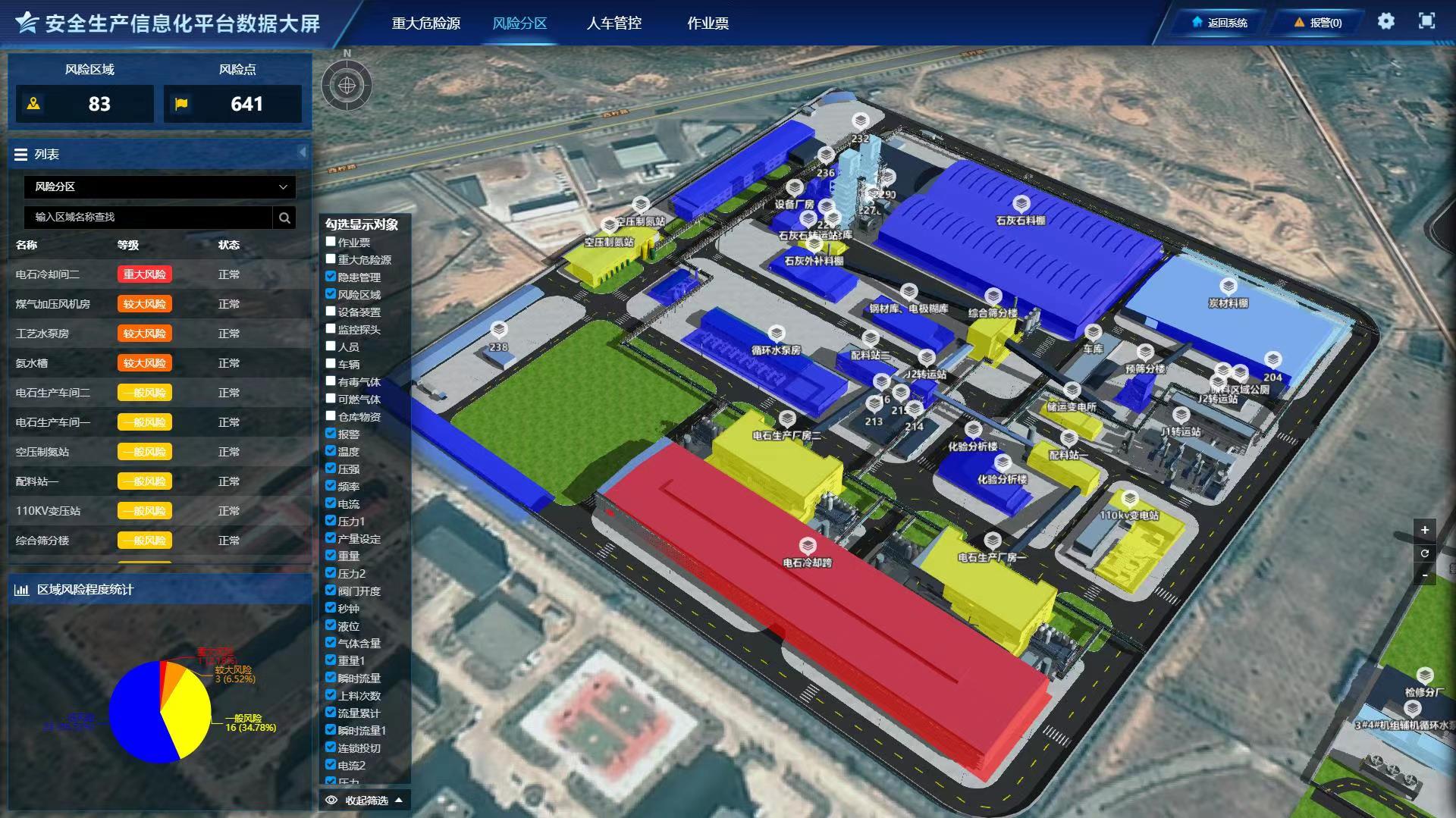 為進(jìn)一步提升安全管理水平,該公司建立了一套適用于自身安全生產(chǎn)管理為一體的雙重預(yù)防機(jī)制數(shù)字化平臺(tái)。結(jié)合高精度定位技術(shù)與3D建模、數(shù)字孿生、數(shù)據(jù)分析等技術(shù)集成,建設(shè)了重大危險(xiǎn)源監(jiān)測(cè)預(yù)警系統(tǒng)(合并有毒可燃?xì)怏w監(jiān)測(cè)預(yù)警)、風(fēng)險(xiǎn)隱患雙重預(yù)防管理系統(tǒng)、安全生產(chǎn)全流程系統(tǒng)以及人員在崗在位管理系統(tǒng),實(shí)現(xiàn)了多種業(yè)務(wù)的信息化管理??赏ㄟ^鳥瞰、“3D”視圖、局部特寫等形式,對(duì)生產(chǎn)線、工藝流程、生產(chǎn)設(shè)備進(jìn)行可視化管控,大幅提升了工廠生產(chǎn)效率和質(zhì)量管理,降低了運(yùn)營(yíng)成本。