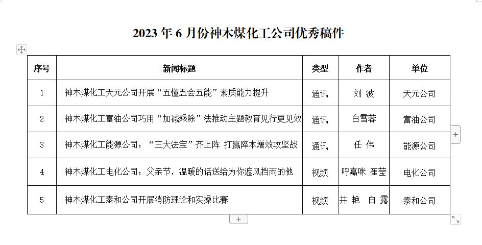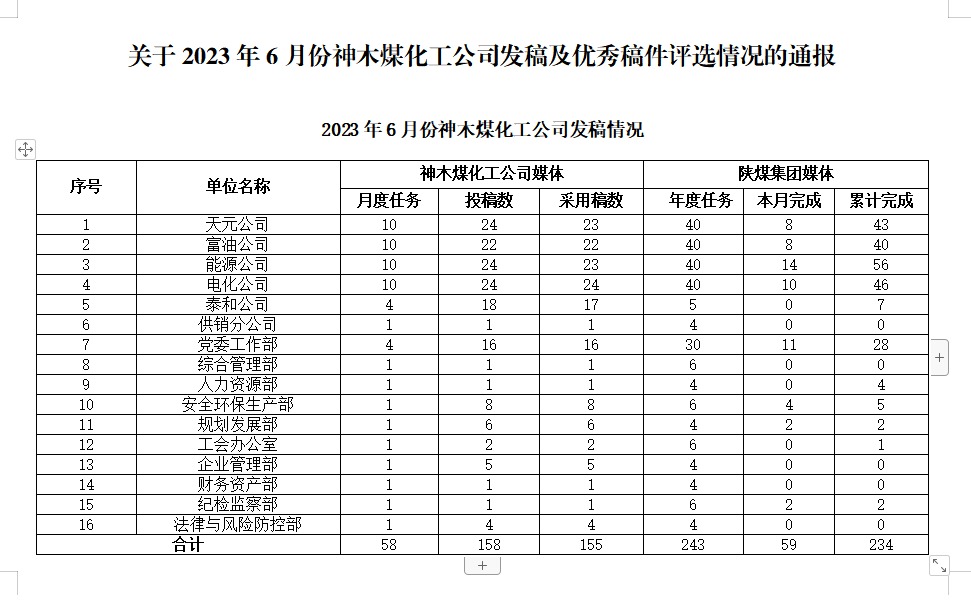 關(guān)于2023年6月份神木煤化工公司發(fā)稿及優(yōu)秀稿件評選情況的通報