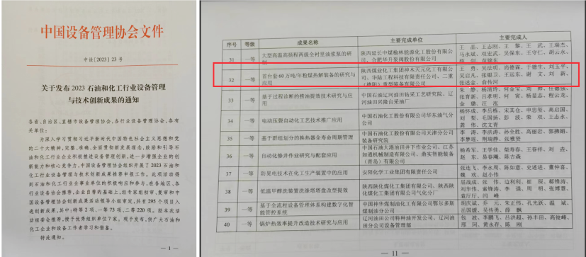 近日,中國設備管理協會下發了《關于發布2023年石油和化工行業設備管理與技術創新成果的通知》,神木煤化工天元公司與華陸工程科技有限責任公司、二重(德陽)重型裝備有限公司合作開發的“首臺套60萬噸/年粉煤熱解裝備的研究與應用”技術創新成果榮獲一等獎。