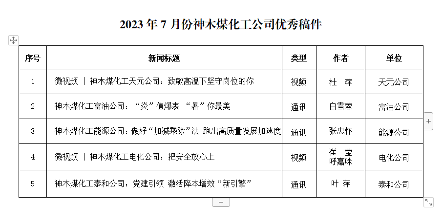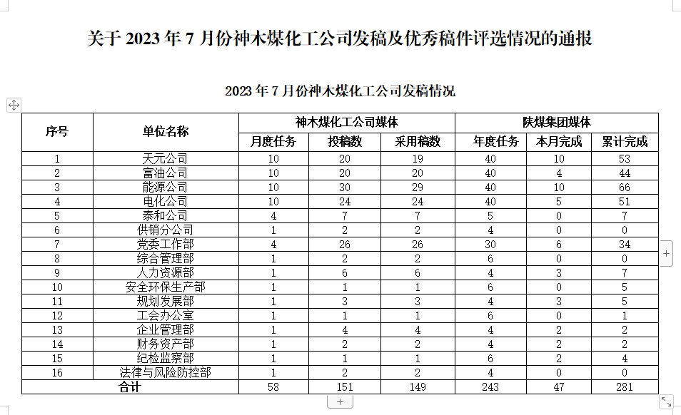 關(guān)于2023年7月份神木煤化工公司發(fā)稿及優(yōu)秀稿件評(píng)選情況的通報(bào)