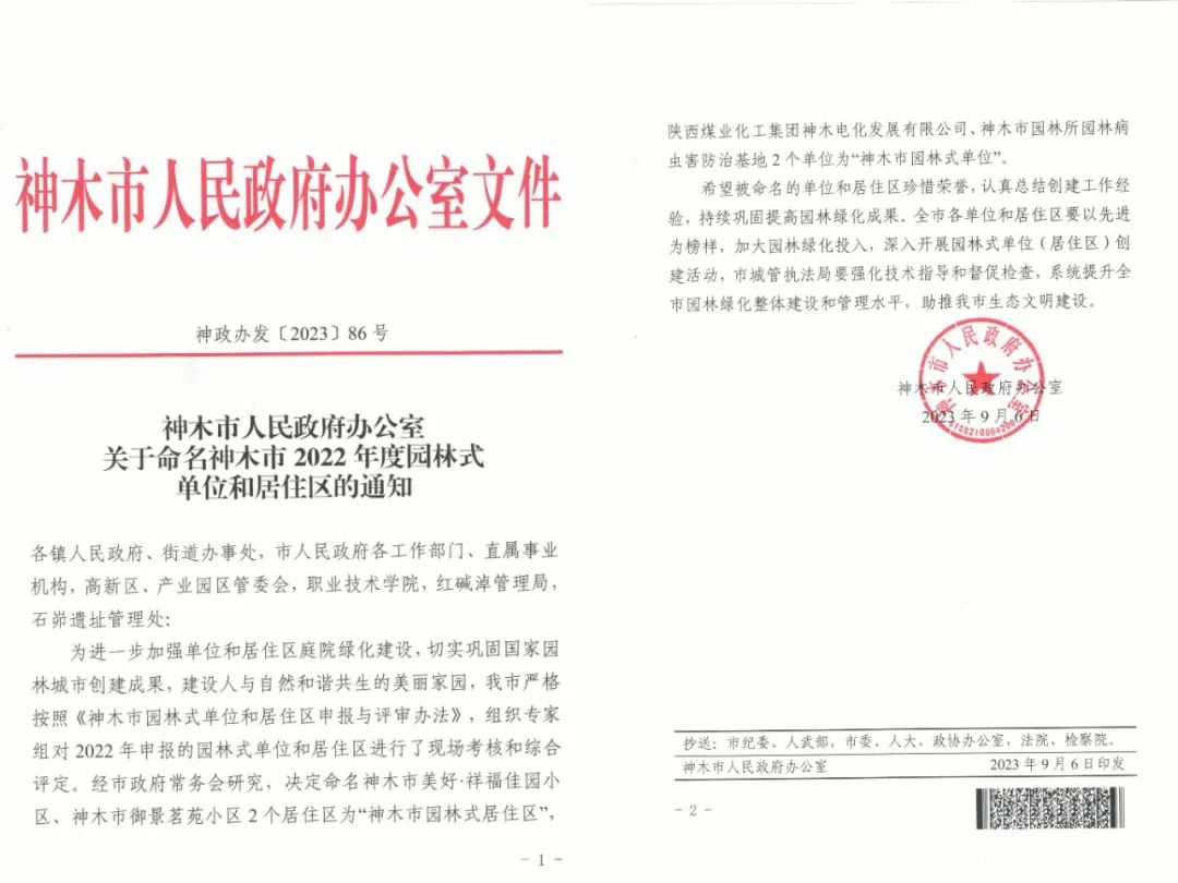 近日,在神木市人民政府公布《關(guān)于命名神木市2022年度園林式單位和居住區(qū)的通知》(神政發(fā){2023}86號(hào))中,神木煤化工電化公司被授予“2022年度神木市園林式單位”榮譽(yù)稱(chēng)號(hào)。
