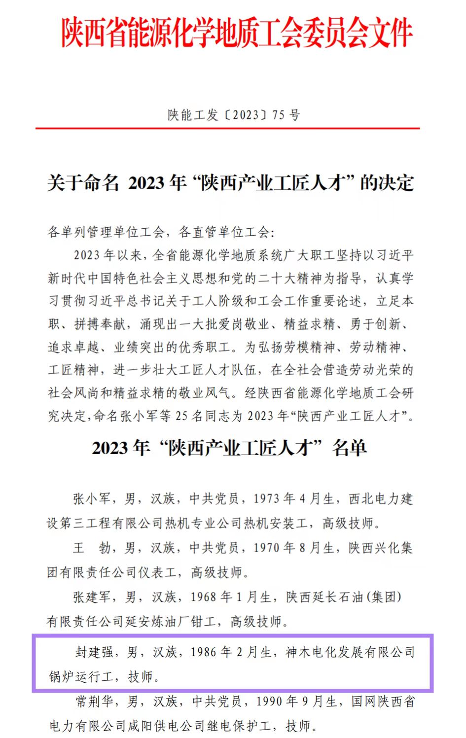 10月30日,2023 年“陜西產業工匠人才”名單新鮮出爐,神木煤化工電化公司鍋爐運行工、陜西省“技術能手”封建強榜上有名。