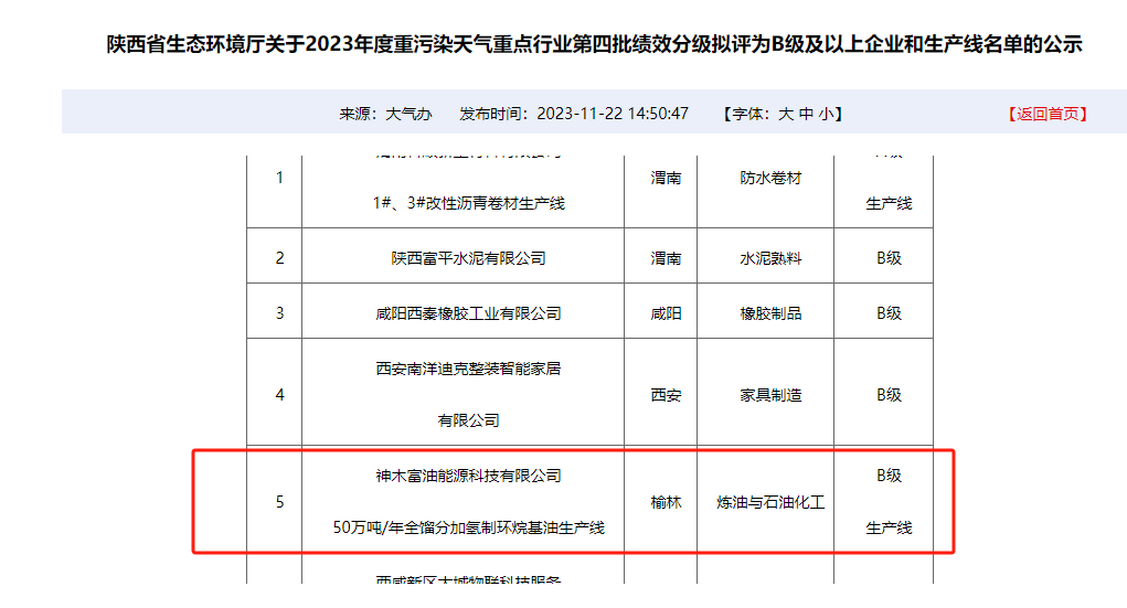 近日,神木煤化工富油公司順利通過省環保廳環保績效B級企業評審,成為陜北地區首家也是唯一一家煤化工行業環保績效B級企業。