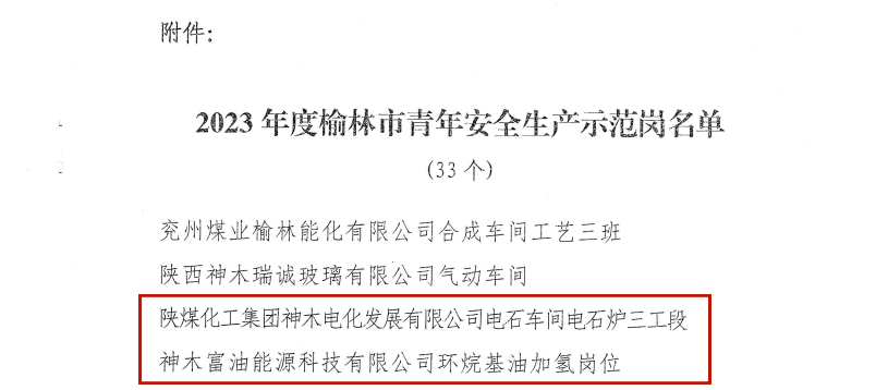 其中,神木煤化工電化公司電石車間電石爐三工段、神木煤化工富油公司環烷基油加氫崗位榮獲“2023年度榆林市青年安全生產示范崗”稱號。神木煤化工天元公司制氫二班、神木煤化工富油公司生產調度中心、神木煤化工能源公司消防救援隊榮獲“2023年度神木市青年安全生產示范崗”稱號。