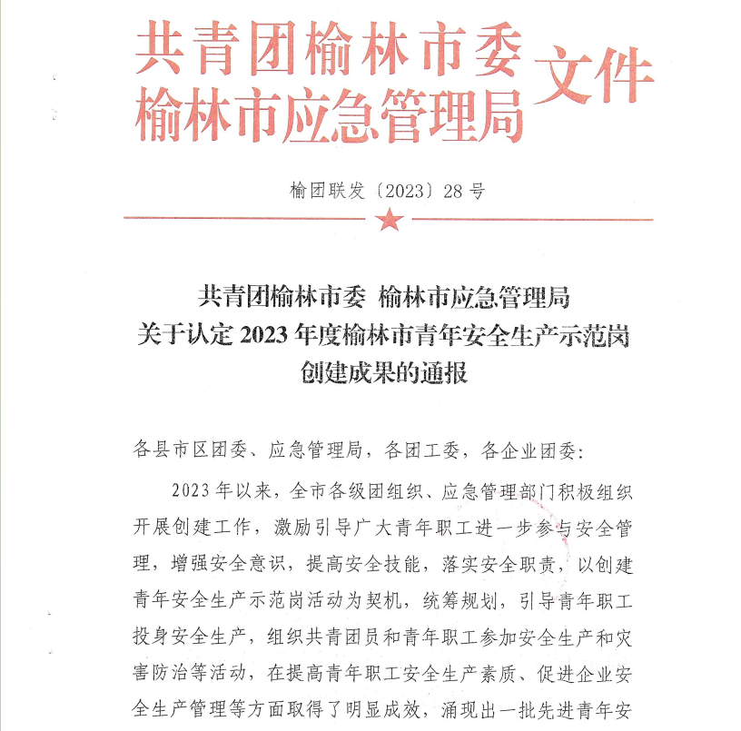 近日,從共青團榆林市委、共青團神木市委、榆林市和神木市應急管理局傳來喜訊,神木煤化工公司所屬單位5個班組榮獲榆林市和神木市“青年安全生產示范崗”榮譽稱號。