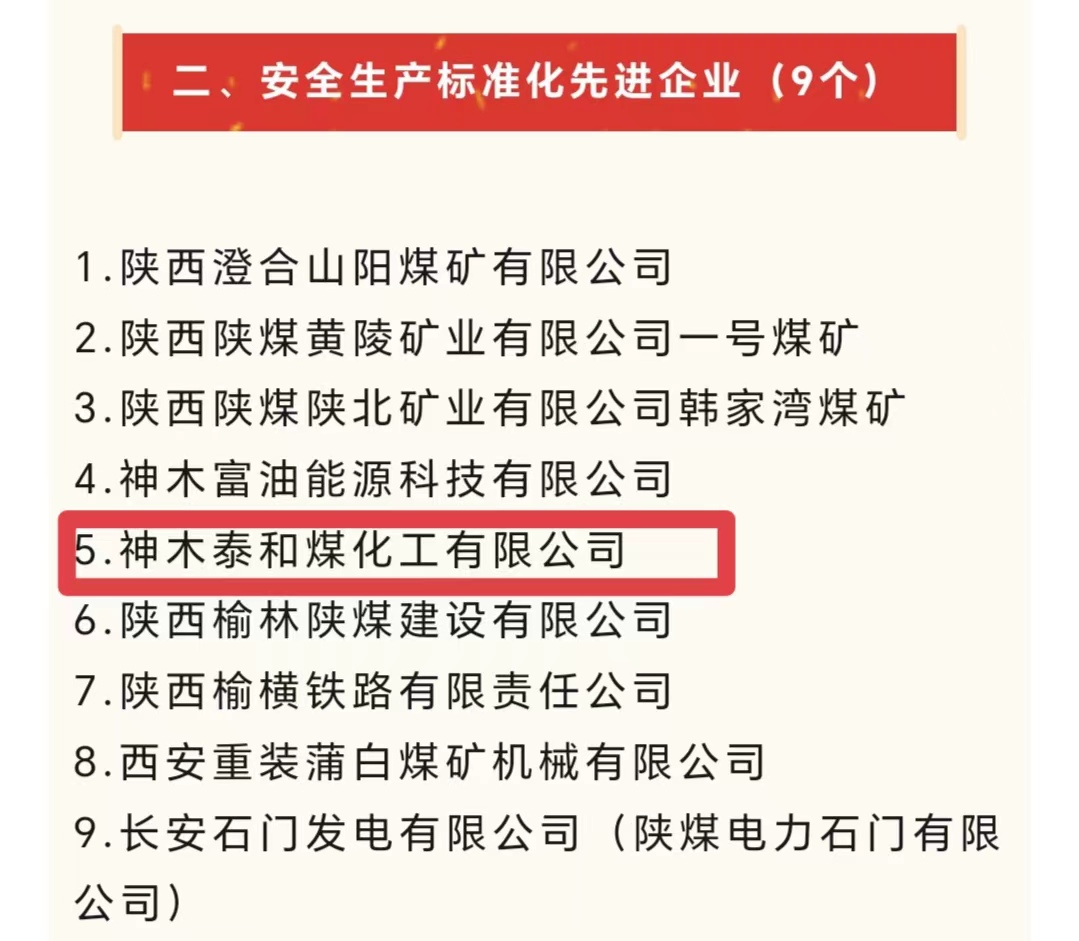 泰和公司榮獲陜煤集團(tuán)安全生產(chǎn)標(biāo)準(zhǔn)化先進(jìn)企業(yè)榮譽(yù)稱號(hào)