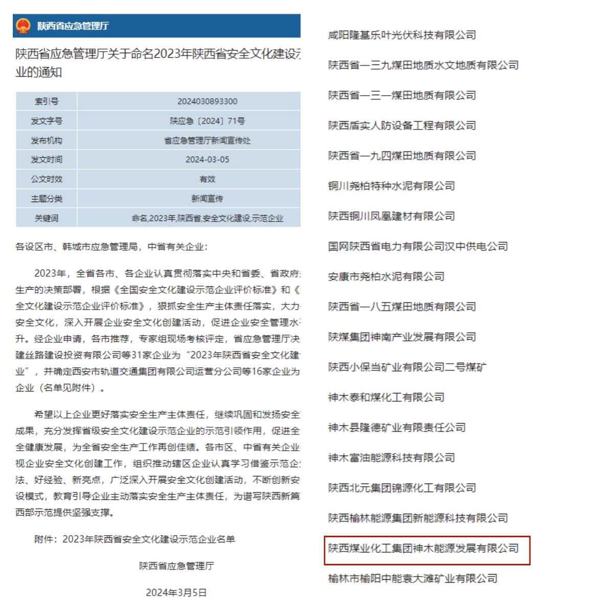 3月5日,陜西省應(yīng)急管理廳印發(fā)《陜西省應(yīng)急管理廳關(guān)于命名2023年陜西省安全文化建設(shè)示范企業(yè)的通知》,神木煤化工能源公司獲評“2023年陜西省安全文化建設(shè)示范企業(yè)”,該榮譽(yù)稱號是該公司安全管理工作全方位、綜合性的考核評價(jià),更是該公司在安全文化建設(shè)工作方面成效顯著的重要標(biāo)志。