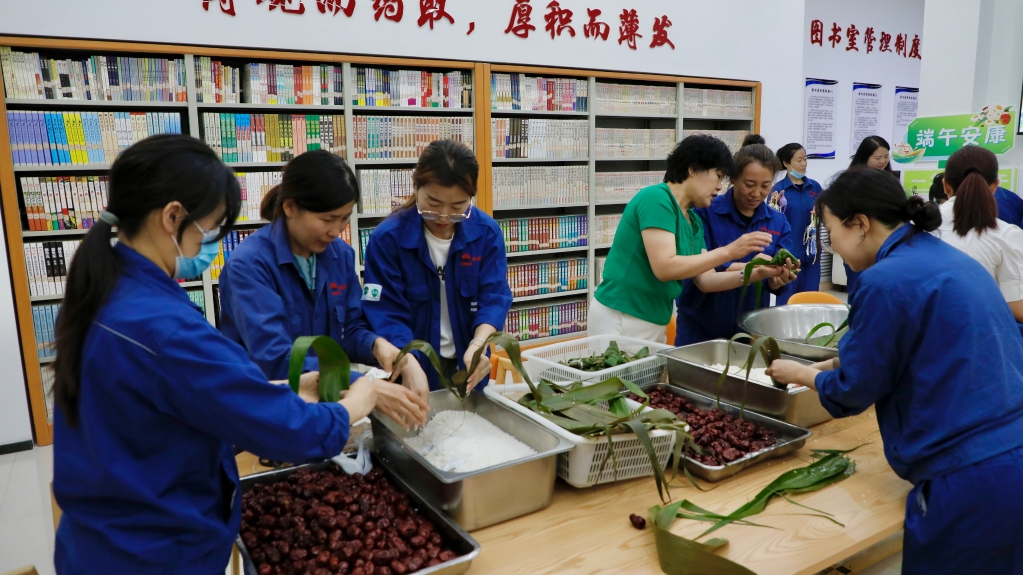 活動現場,該公司提前準備了泡好的糯米、粽葉、粽料。會包粽子的職工家屬現場傳授包粽子技巧,耐心指導:“我們首先把粽葉一頭卷成漏斗型,然后向里放米,放到一多半的時候,將紅棗塞進米里,上面再放點米壓緊抹平后把粽葉翻過來蓋好用葉子纏住,咱們的粽子不需要繩子也一樣很緊。這樣,一個可愛的粽子就包好了。”隨后,職工們迫不及待上手實踐,不一會兒,三角形、多邊形、長條形……各式各樣的粽子在職工們手中誕生,大家紛紛展示自己的勞動成果。