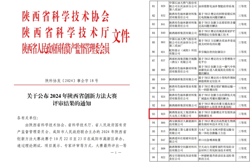 近日,陜西省科學技術學會公布了2024年陜西省創新方法大賽評審結果,神木煤化工天元公司“基于TRIZ創新理論開發煤焦油提酚新技術”創新成果經過項目展示、現場答辯、專家點評等多環節的激烈角逐,脫穎而出,榮獲三等獎。