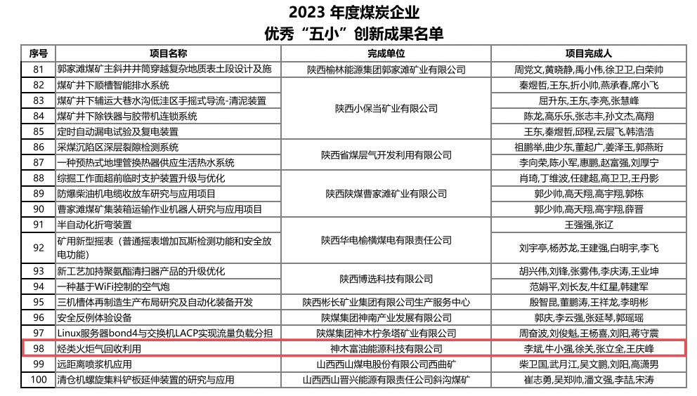 近日,中國煤炭工業協會公布了2023年度煤炭企業優秀“五小”創新成果評審結果,神木煤化工富油公司報送的“烴類火炬氣回收利用”獲評行業引領型創新成果。