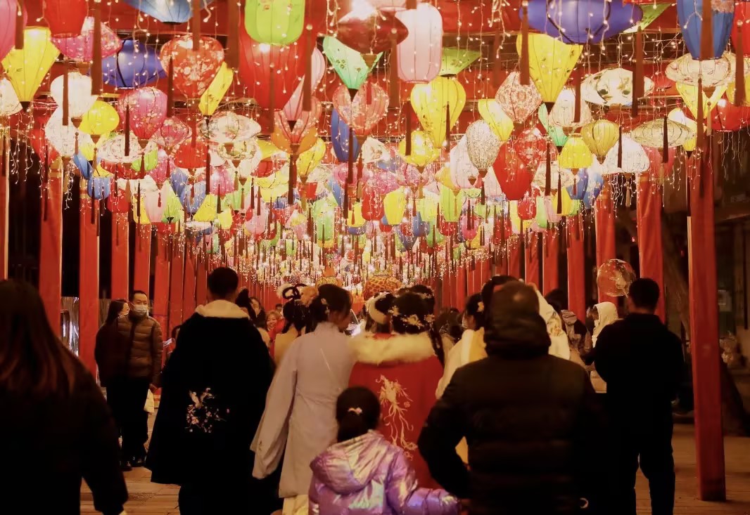 我們順著人流,慢慢挪到了鐘樓洞跟前,一抬頭,大紅燈籠高高掛,上面畫著蛇年的吉祥圖案,還有一些寫著祝福話語的,在微風(fēng)里輕輕晃悠。旁邊的樹上也掛滿了彩燈,一閃一閃的,像漫天星辰遺落在了這麟州街。