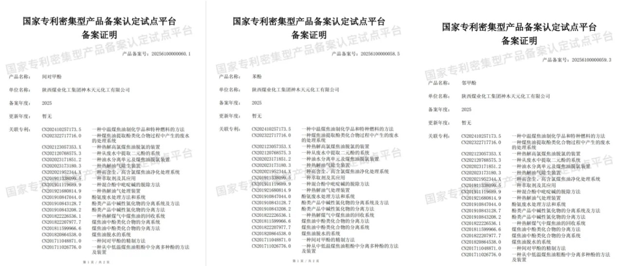 近日,神木煤化工天元公司生產的苯酚、鄰甲酚和間對甲酚3種產品通過國家專利密集型產品備案認定試點平臺備案。