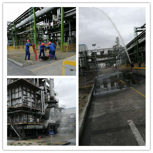 從發(fā)現(xiàn)泄漏點(diǎn)、報(bào)告車間和生產(chǎn)部,到立即啟動(dòng)車間級(jí)應(yīng)急預(yù)案,緊急泄壓、現(xiàn)場警戒、爐膛通滅火蒸汽、切斷燃料氣、投用消防炮對(duì)周圍設(shè)備和管線進(jìn)行降溫防護(hù)等一系列模擬操作,演練人員合理分工、密切配合,圓滿完成了演練任務(wù)。