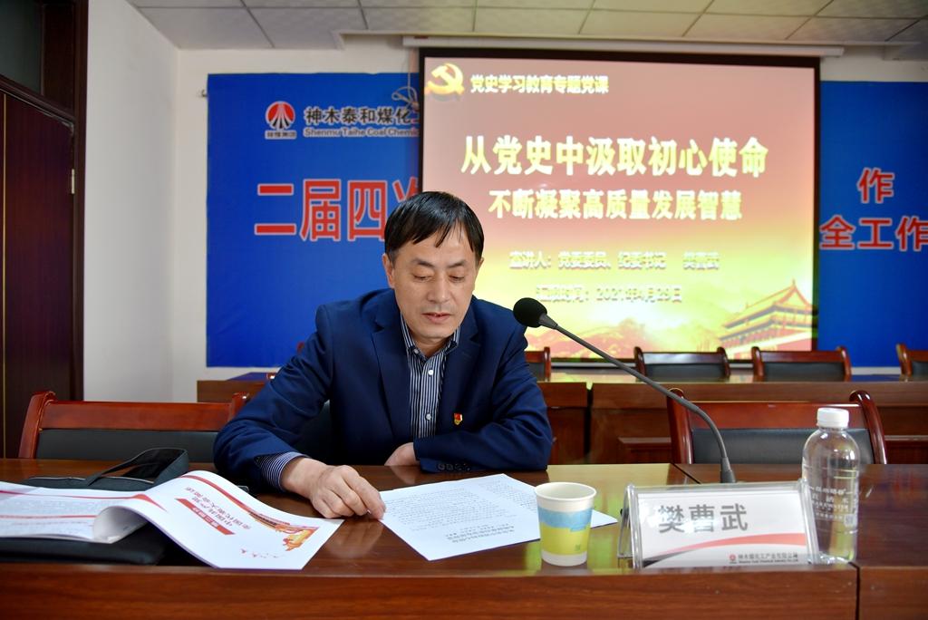強(qiáng)調(diào)要求全體黨員干部特別是領(lǐng)導(dǎo)干部,要始終牢記黨的初心和使命,不斷增強(qiáng)“四個(gè)意識(shí)”、堅(jiān)定“四個(gè)自信”、做到“兩個(gè)維護(hù)”,把初心和使命轉(zhuǎn)變成銳意進(jìn)取、開(kāi)拓創(chuàng)新的精氣神和埋頭苦干、真抓實(shí)干的原動(dòng)力。從黨史中汲取追趕超越的動(dòng)力,從黨史中汲取高質(zhì)量發(fā)展的智慧,從黨史中尋找我們的初心使命,從黨史中淬煉靈魂,提升修養(yǎng),全面推進(jìn)技術(shù)創(chuàng)新再出新成果,在生產(chǎn)經(jīng)營(yíng)、安全環(huán)保管理再上新臺(tái)階,全面推進(jìn)從嚴(yán)治黨不斷向縱深發(fā)展,努力為泰和公司、神木煤化工的高質(zhì)量跨越發(fā)展貢獻(xiàn)智慧和力量。