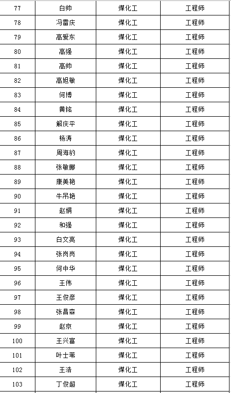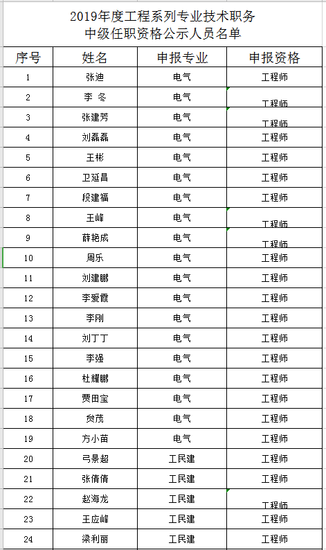 經(jīng)公司工程系列專(zhuān)業(yè)技術(shù)職務(wù)中級(jí)任職資格評(píng)審委員會(huì)2020年1月11日評(píng)審會(huì)議表決,2019年度工程系列專(zhuān)業(yè)技術(shù)職務(wù)初中級(jí)任職資格共408人通過(guò)認(rèn)定、評(píng)審(其中:初級(jí)279人,中級(jí)129人),現(xiàn)將認(rèn)定、評(píng)審?fù)ㄟ^(guò)人員名單公示如下: