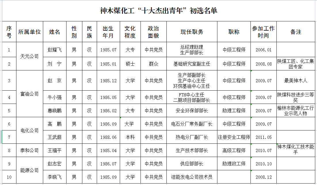 公司“十大杰出青年”評選活動于3月份啟動以來,經歷人選推報、資格審查、評審確定等環節,在“公平、公正、公開”的基礎上產生了“十大杰出青年”。現將評選結果予以公示。如對公示人選持有異議,歡迎廣大干部職工向活動組委會辦公室(黨委工作部)反映情況。具體如下: