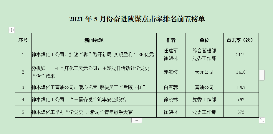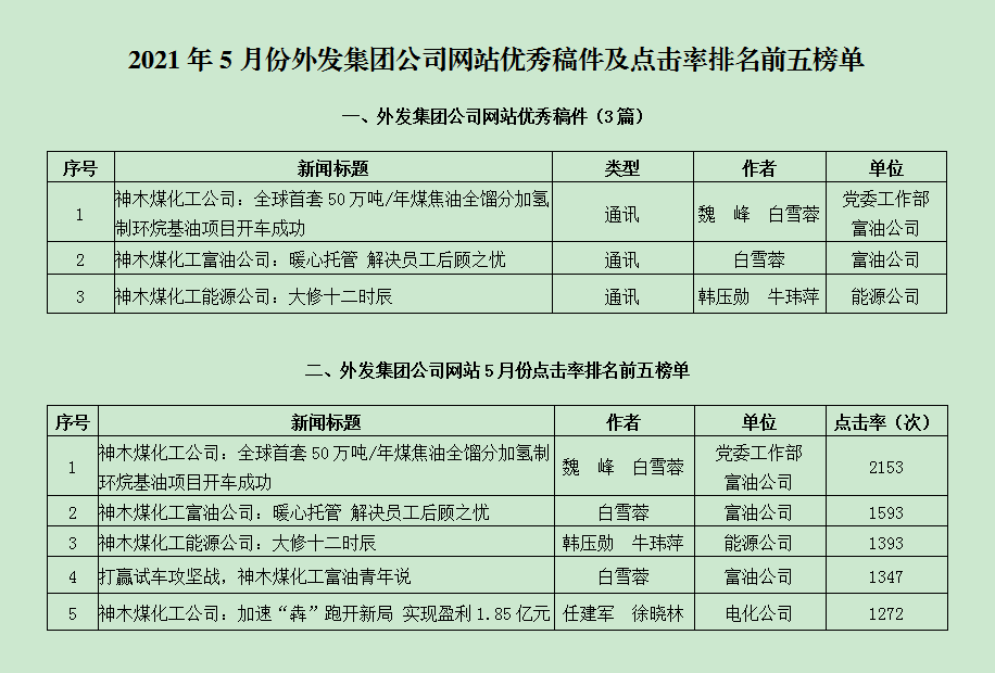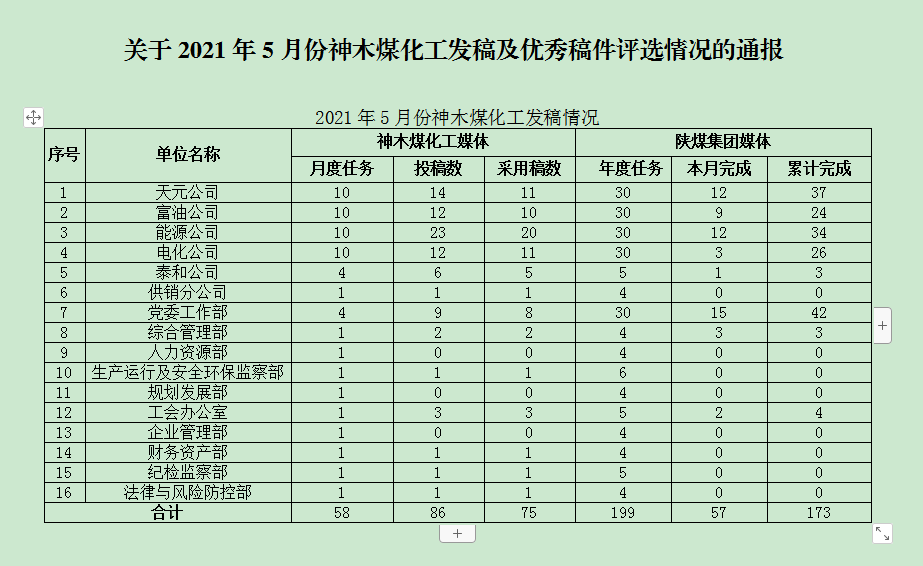 關于2021年5月份神木煤化工發稿及優秀稿件評選情況的通報
