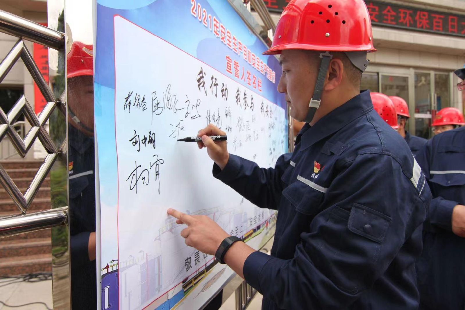 “為了職工的生命安全、家庭的幸福,為了企業的科學發展,社會的和諧美麗,我宣誓......”電化公司副總經理張德亮帶領全體參會人員,舉起右拳,莊嚴宣誓,并鄭重地在誓詞簽名墻上簽名。