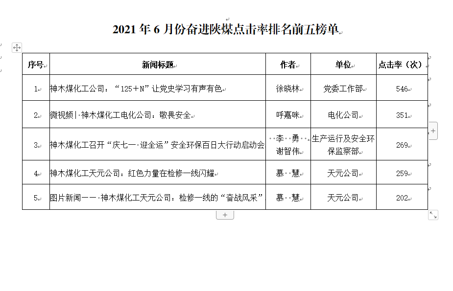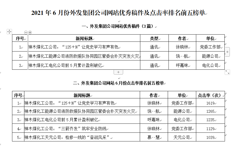 關(guān)于2021年6月份神木煤化工公司發(fā)稿及優(yōu)秀稿件評(píng)選情況的通報(bào)