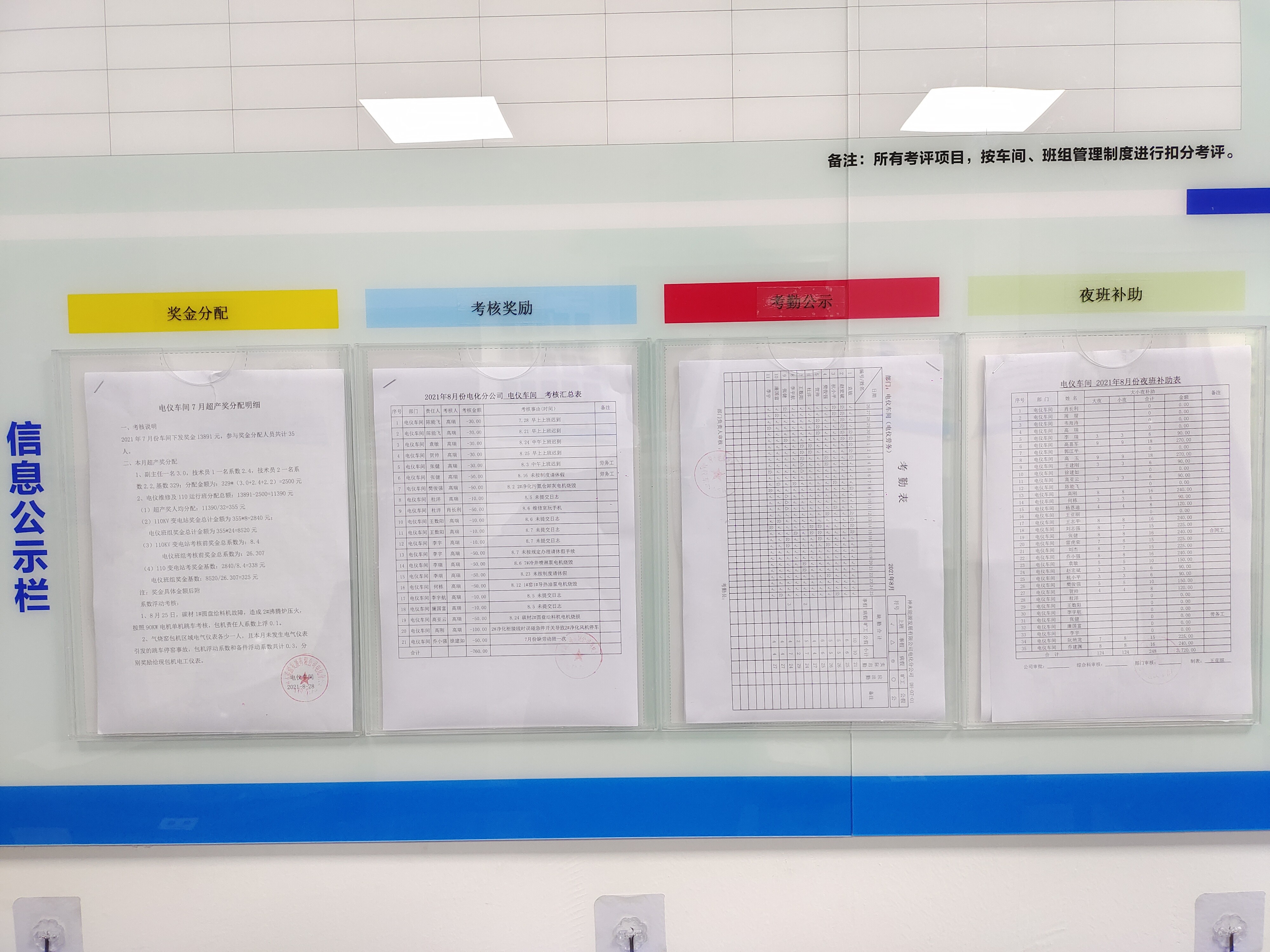“風行班組”在“標準化班組建設”過程中,積極打造“學習型、安全型、清潔型、節約型、和諧型”班組,做到事故責任明確化。班組對設備、片區、包機人、異常情況等設置專欄,分別用紅、橙、黃、粉、綠五色標識進行區別,成為彰顯班組特色的靚麗“明信片”。同時,該班組大力倡導民主管理,定期公示獎金分配、考核獎勵、考勤公示、夜班補助、培訓計劃以及師帶徒等廠務工作信息,確保廠務公開透明。