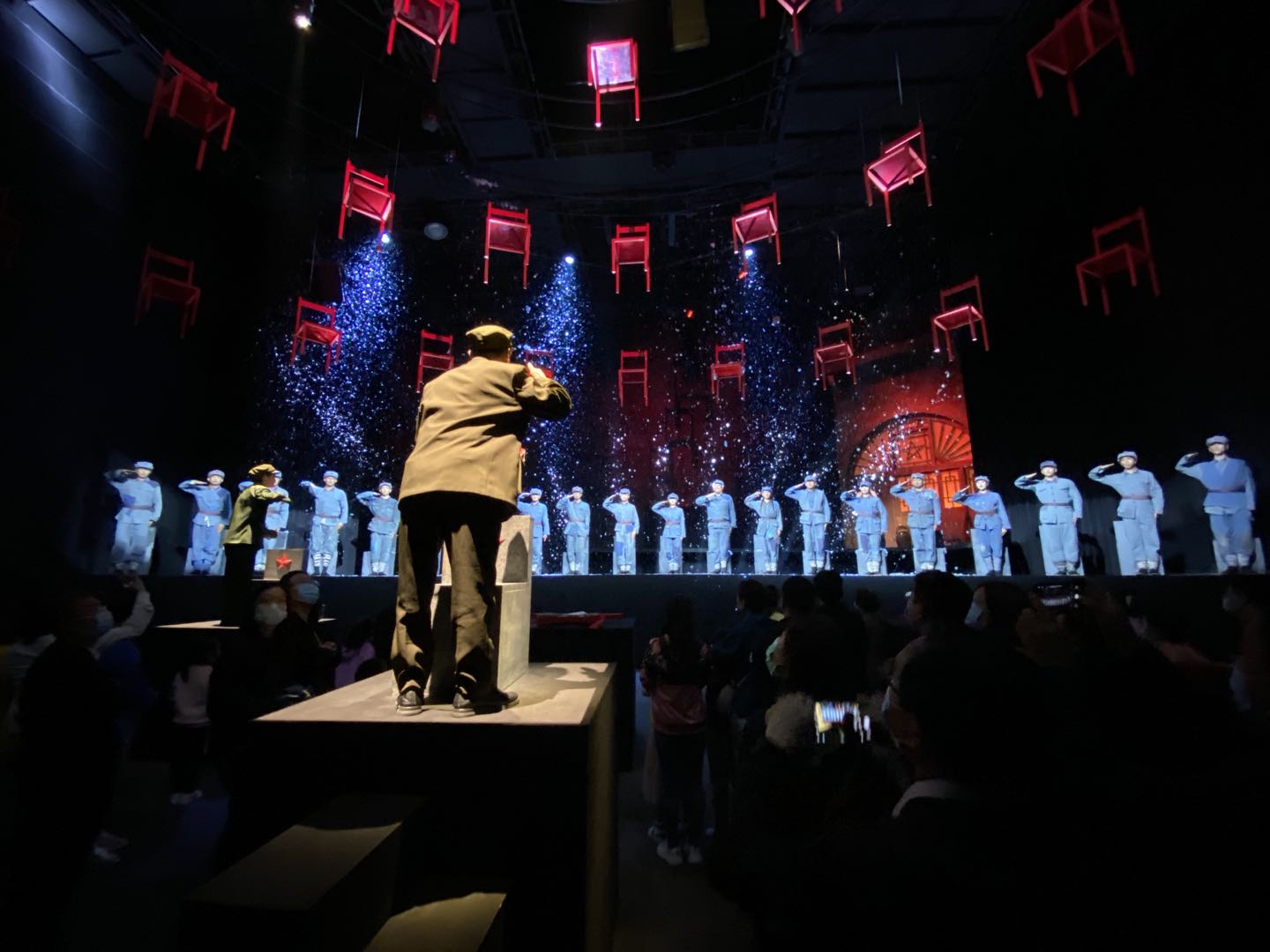 9月19日晚上7點(diǎn),大家在延安紅街觀看了沉浸式情景劇《再回延安》。該劇為四幕劇,以一本老紅軍的日記為線索,講述了一個(gè)紅旗班的故事,采用典型的“小人物、大主題,小場(chǎng)景、大視覺(jué)”的表達(dá)手法,給觀眾展示了那一路走來(lái)的心酸不易和頑強(qiáng)堅(jiān)定的意志。故事由日記的主人劉寶順之孫以第一人稱的視角講述。不同于以往“坐著看”,此次沉浸式的演出采用了行進(jìn)式“走著看”,劇情會(huì)隨著故事的推移切換場(chǎng)景。演出在《歌唱祖國(guó)》的大合唱中落下帷幕。