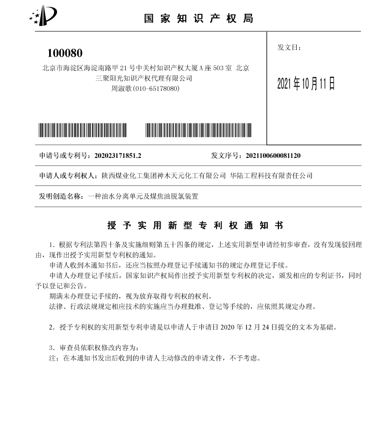 近日,神木煤化工天元公司申請的“一種油水分離單元及煤焦油脫氯裝置”實用新型專利獲得國家知識產權局授權。