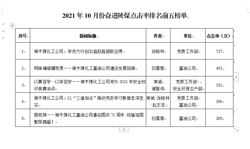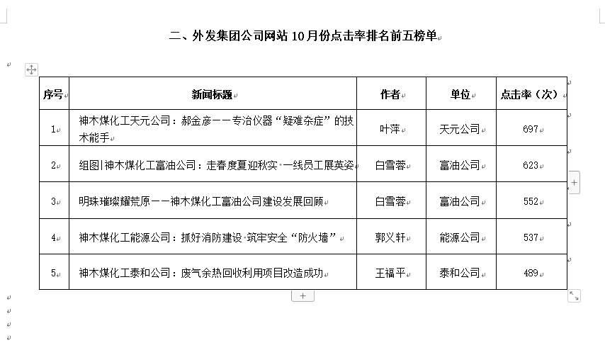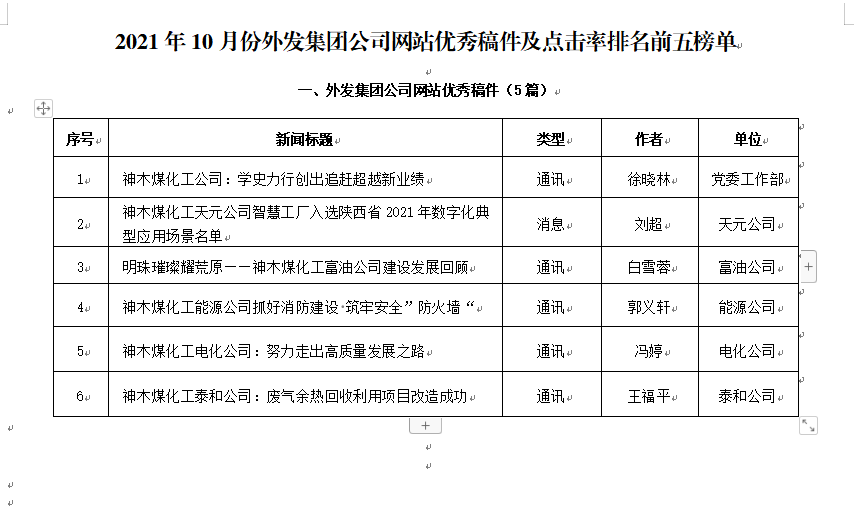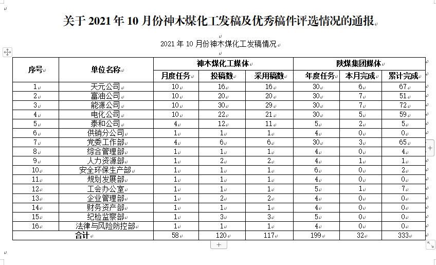 關(guān)于2021年10月份神木煤化工公司發(fā)稿及優(yōu)秀稿件評(píng)選情況的通報(bào)