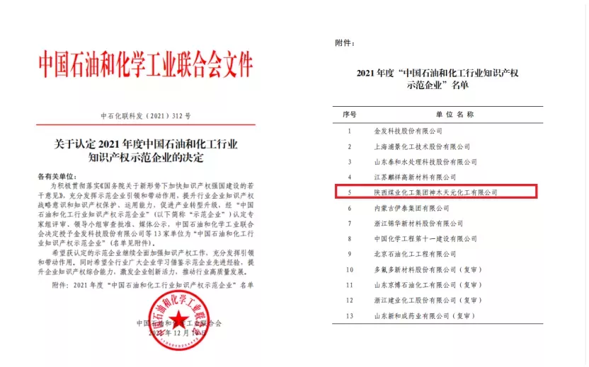 近日,中國石油和化學工業聯合會下發了《關于認定2021年度中國石油和化工行業知識產權示范企業的決定》,天元公司成功入選,成為該年度陜西省唯一上榜企業。
