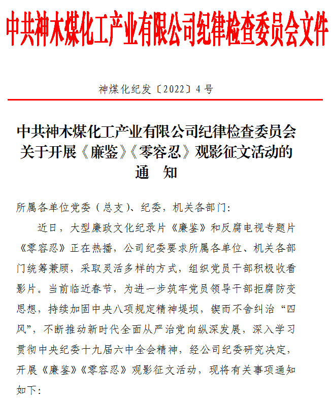 為進一步深入推進警示教育常態化、制度化,堅持標本兼治推進黨風廉政建設,持之以恒抓細抓實黨員干部黨性黨風黨紀教育,1月22日神木煤化工紀委在全公司范圍內開展《廉鑒》《零容忍》觀影征文活動,充分發揮警示教育的預防和示范帶動作用,以案釋紀、以案釋法,筑牢“不想腐”的思想防線,確?!肮勒?、清正廉潔”核心理念成為黨員領導干部的思想自覺和行動自覺,進一步鞏固風清氣正、干事創業的良好氛圍。