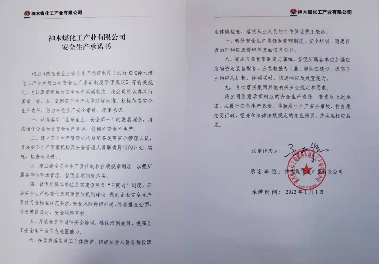 神木煤化工產(chǎn)業(yè)有限公司2022年安全生產(chǎn)承諾書公示