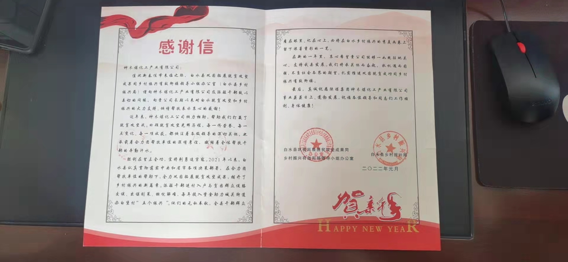 白水縣鄉村振興局向神木煤化工公司發來感謝信