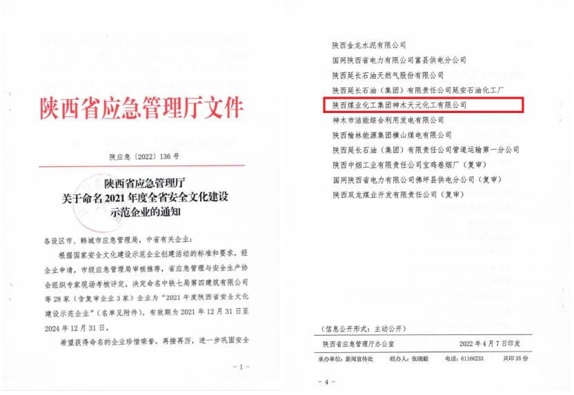 近日,陜西省應(yīng)急管理廳命名的“2021年陜西省安全文化建設(shè)示范企業(yè)”名單揭曉,神木煤化工天元公司成功入選,成為全省28家獲此殊榮的企業(yè)之一。