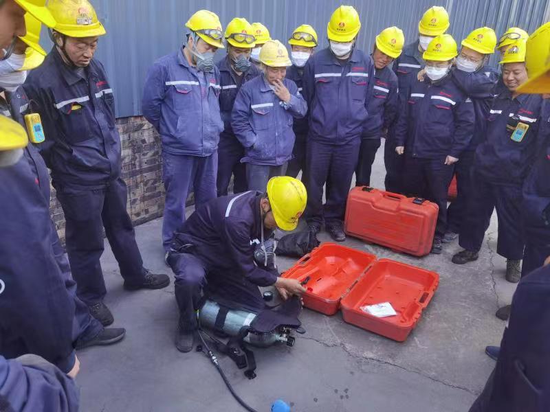 近日,神木煤化工泰和公司組織應急隊伍人員在焦化車間三平臺開展空氣呼吸器實操訓練。